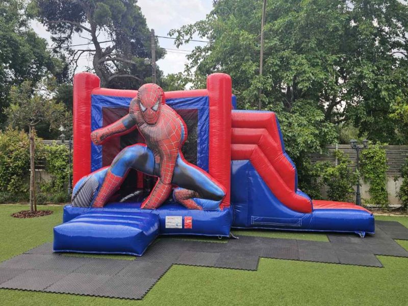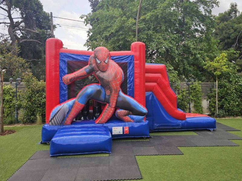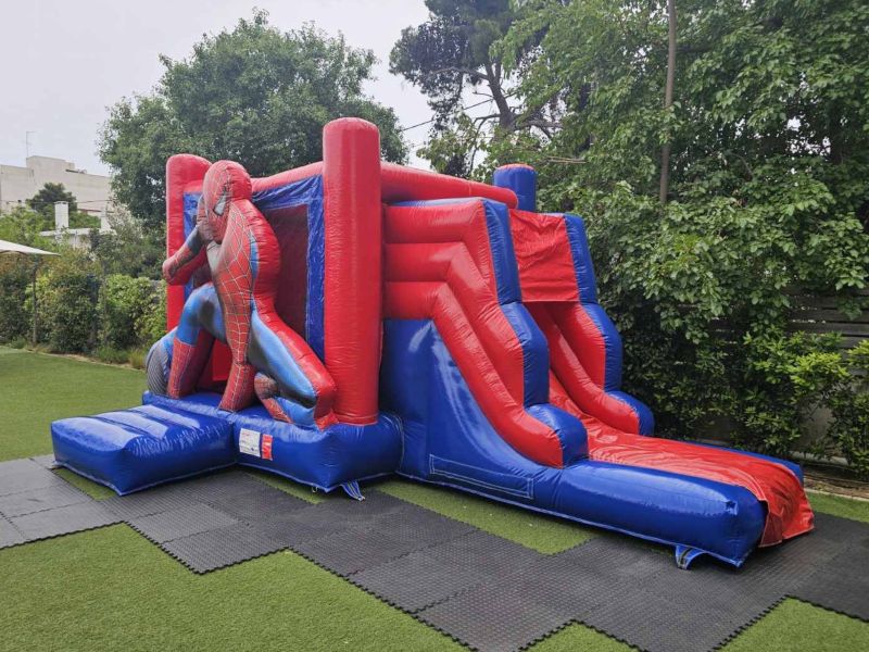 Το Φουσκωτό Spiderman είναι κατάλληλο για ηλικίες 2 έως 12 ετών. Έχει διαστάσεις 6,0×4,2×3,0 μέτρα και είναι διαθέσιμο προς ενοικίαση για παιδικές εκδηλώσεις.